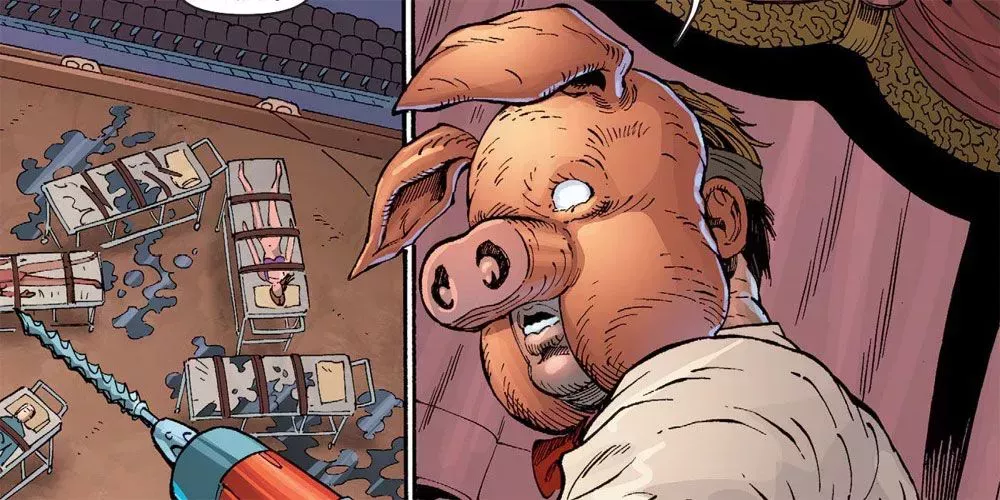 El Profesor Pyg, creado por Grant Morrison y Andy Kubert, es uno de los villanos más extraños y espeluznantes de Batman. Científico demente, el Profesor Pyg está obsesionado con el mito de Pigmalión y la idea de la perfección física (una interesante elección para un hombre con máscara de cerdo).