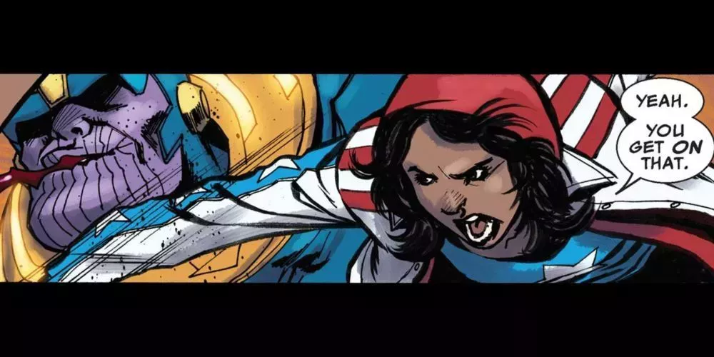 América Chávez y el resto de Los Ultimates detienen al Titán Loco antes de que pudiera robar el cubo, pero Máquina de Guerra acaba siendo asesinada por él. Después de que Thanos escape de su encarcelamiento, inmoviliza a América y al Capitán Marvel, y casi escapan de sus garras hasta que Pantera Negra y Blue Marvel utilizan un dispositivo para apagarlo, dejando a Thanos incapacitado pero aún respirando.