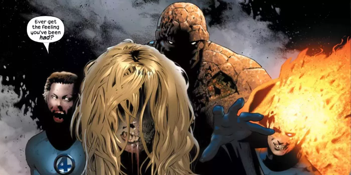 1Los Cuatro Fantásticos Definitivos son bastante diferentes de la mayoría de las interpretaciones del equipo. Uno de sus enfrentamientos más encarnizados fue con una versión alternativa de ellos mismos. Sin embargo, Sue, Reed, Johnny y Ben habían sido zombificados por un virus desconocido y trataban de extender su plaga al Universo Ultimate.