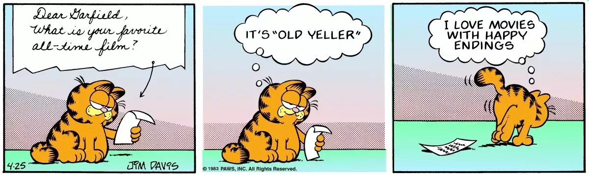Por supuesto, Old Yeller es una de las películas más tristes jamás rodadas. Sin embargo, como los lectores saben desde hace años por su relación con Odie, Garfield no odia nada más que a los perros. Llamar a Old Yeller su película favorita es a la vez atrevido e irreverente por la forma en que Garfield deja caer la carta y se marcha sin inmutarse.