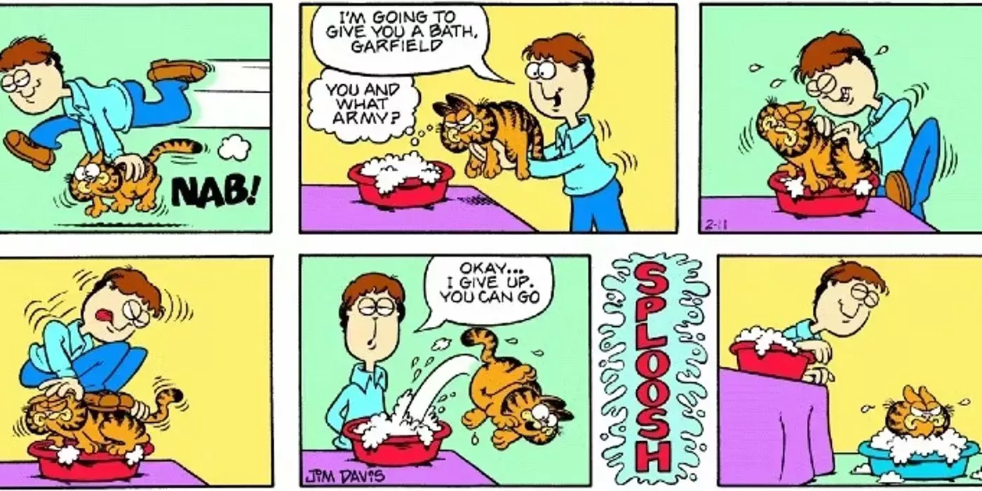 La mayoría de las veces, es Jon quien sufre las bromas pesadas de Garfield. En una rara inversión de la fortuna, este cómic muestra a Garfield siendo burlado por su dueño mientras perpetúa el chiste sobre lo mucho que Garfield odia el agua y los baños. La yuxtaposición de la cara de felicidad de Jon y la expresión de enfado de Garfield en el último panel es puro oro cómico.