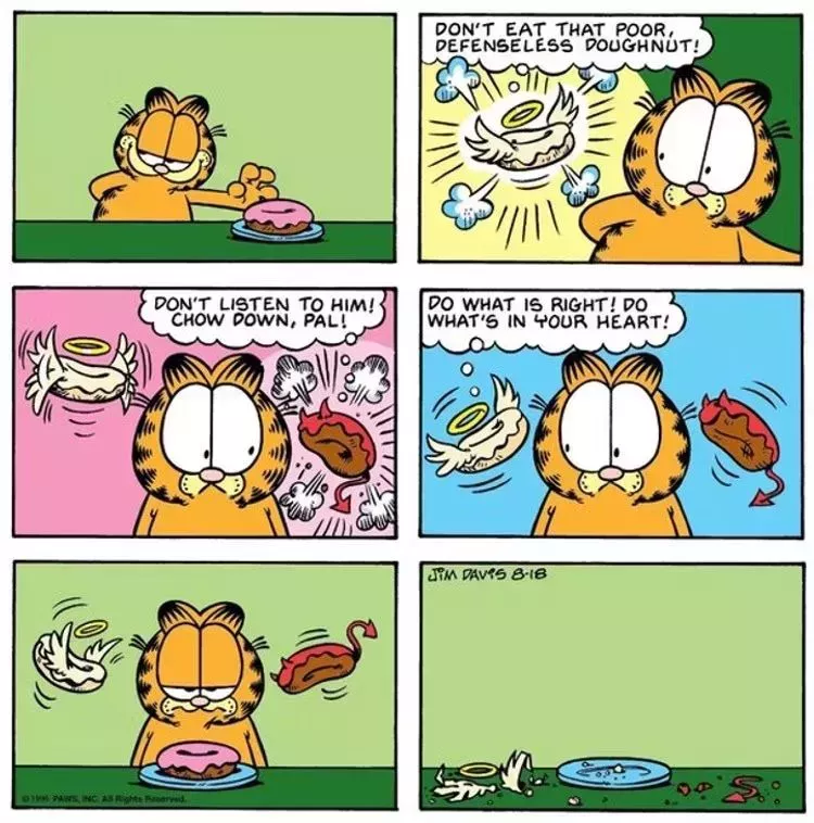 Pocas cosas apaciguan más a Garfield que la comida en la longeva tira cómica. Garfield suele vivir para meterse en la barriga la mayor cantidad de comida posible. Sin embargo, en una divertida crisis de conciencia, donuts angelicales y demoníacos se posan en su hombro y debaten sobre la moralidad de su inminente tentempié.
