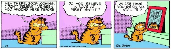 Una de las principales razones por las que Garfield rara vez tiene una pareja romántica es su vanidad narcisista. Eso, y el hecho de que le gusta comer y dormir más que a cualquier ser vivo. La primera característica se transmite maravillosamente en un sencillo cómic de tres paneles en el que Garfield se ve y se corteja a sí mismo en el espejo.