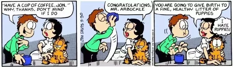 De todas las tiras de Garfield centradas en el café, es difícil superar la vez en que Jon bebió sin querer una taza de fluido reproductor canino, para horror de Garfield. La tira de mayo de 1990 muestra a Jon y Garfield en presencia de una enfermera veterinaria, con Garfield animando a su dueño a beber un sorbo de una taza de café recién hecho.