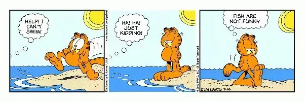 El gato, amante de la lasaña, se fue de excursión a la playa, donde los peces le gastaron una broma pidiéndole ayuda. Ver al perezoso y lacónico Garfield ponerse nervioso, solo para descubrir que él era el blanco de la broma, fue un gran cambio de papeles, sobre todo porque solía gastarle bromas similares a Jon.