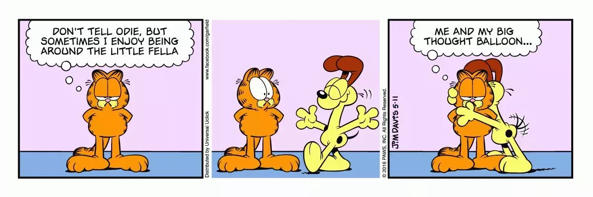 Esta tira se volvió un poco meta con Garfield mencionando las burbujas de pensamiento que componían el cómic, y cómo delataban su rencoroso cariño por Odie. Los dos siempre andaban a la greña, y las meteduras de pata de Garfield con el perro a menudo se traducían en una PDA cómicamente abrumadora por parte de Odie.