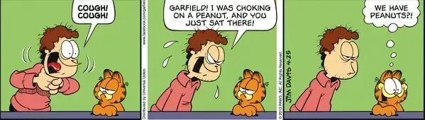 Nada es más importante para Garfield que comer y dormir, dos cosas que adora más que a su dueño, Jon. En una histérica viñeta que resume a la perfección esta ética fundamental, Jon empieza a atragantarse con un cacahuete mientras Garfield no hace más que mirar con cara de pocos amigos.