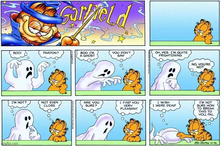 Gran parte del lacónico sentido del humor de Garfield provenía de lo poco impresionado que estaba por las criaturas que le rodeaban. Por ejemplo, en una tira cómica de Halloween, Garfield es abordado por un fantasma que hace todo lo posible por asustarle. Cuanto más se esfuerza el fantasma, menos se asusta Garfield, lo que da lugar a una hilarante escena y a un remate que permite a los lectores rellenar el espacio en blanco.