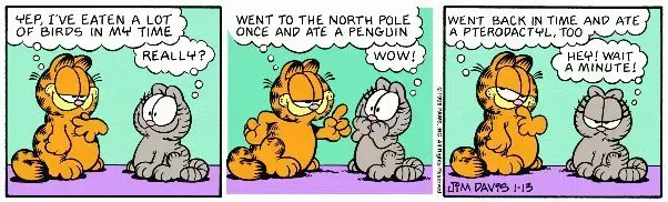 En primer lugar, presumir de cuántos pájaros se ha comido es una forma divertida de causar una primera impresión. Pero decirle a su potencial interés amoroso que ha viajado al Polo Norte para comerse un pingüino y que ha retrocedido en el tiempo para comerse un dinosaurio volador prehistórico es llegar al ridículo. Naturalmente, la gata reacciona con enfado e incredulidad. Garfield no es un hombre de mujeres, y casos hilarantes como éste lo demuestran.