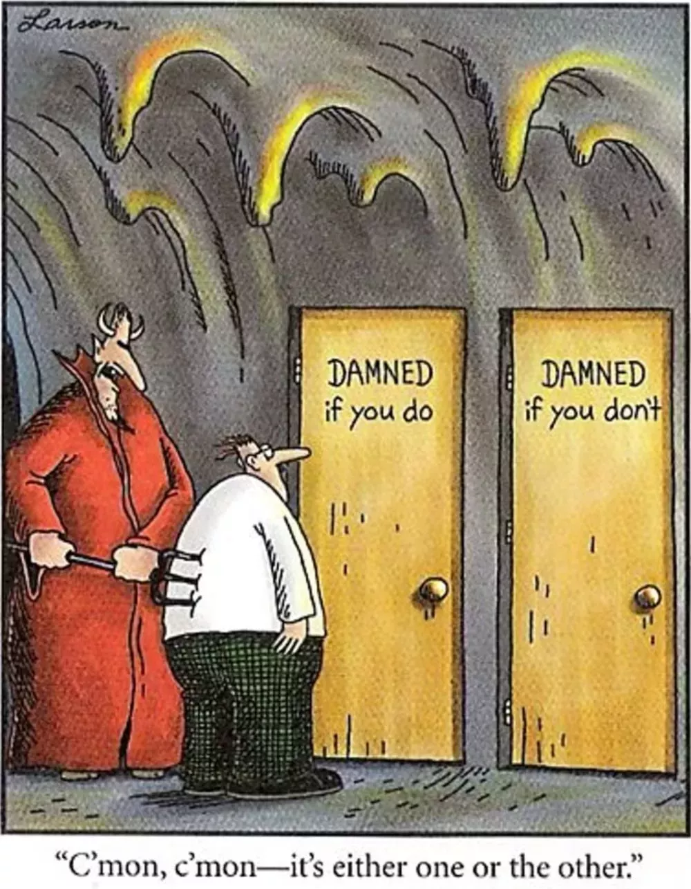 El creador deThe Far Side, Gary Larson, a menudo disfrutaba reflexionando sobre temas teológicos en sus cómics, y tanto Dios como el Diablo son protagonistas de la tira. En este cómic, el Diablo guía a un hombre al Infierno y le obliga a elegir entre dos puertas marcadas con las palabras "Condenado si lo haces" y "Condenado si no lo haces".