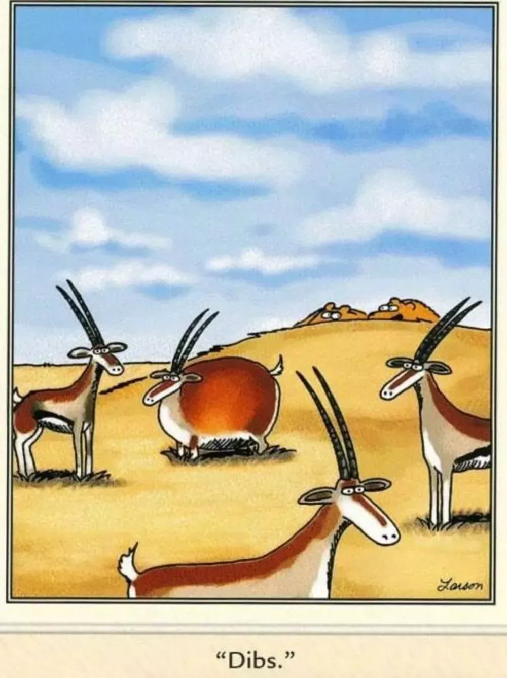 The Far Side sabía decir mucho con muy pocas palabras. Una gran parte de la habilidad de Gary Larson como dibujante consistía en transmitir mucho significado de forma eficaz, ya que los cómics sólo constaban de un único panel. Aquí, el pie de foto es una sola palabra, "Dibs", pronunciada por un león afortunado.