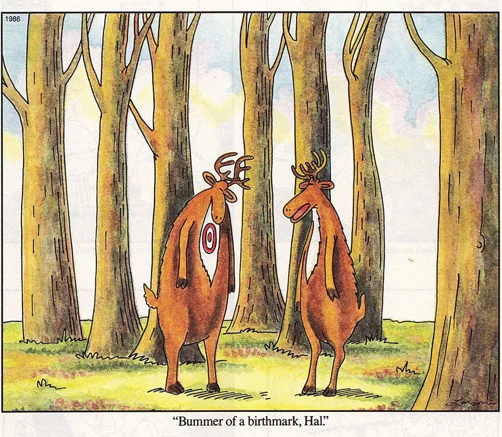 La caza es un pasatiempo popular en muchas partes del mundo y, en Estados Unidos, los ciervos son un objetivo frecuente de los cazadores. Los cómics de Far Side solían retratar situaciones con ciervos y cazadores, ya fueran humanos o animales. A veces las bromas eran a costa de los cazadores, pero otras eran los ciervos los que salían mal parados.