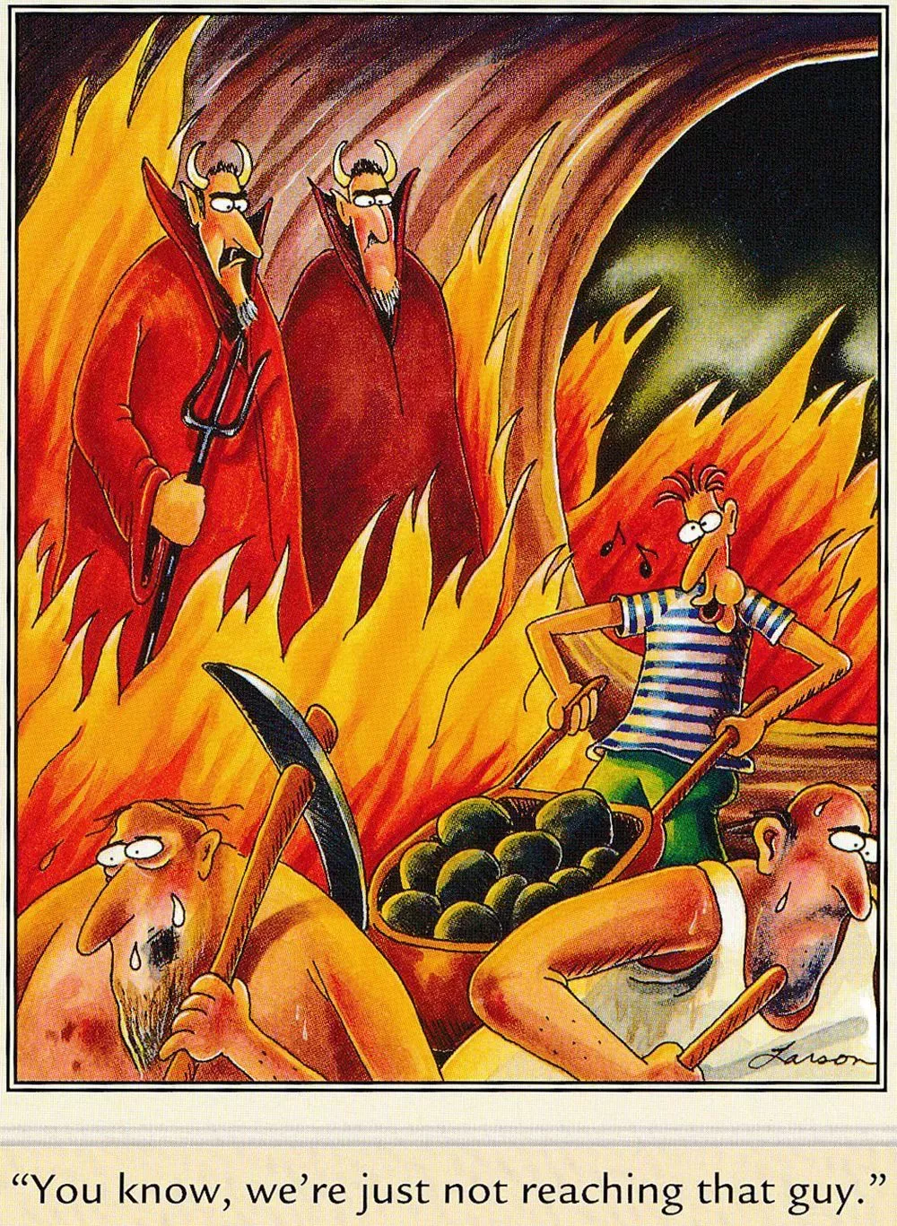 En este dibujo animado del Lado Lejano, dos demonios observan a sus pupilos afanarse entre las llamas del Infierno. Mientras los demás sudan y se sienten miserables, un alma humana silba y se divierte mientras trabaja. Los lectores pueden reírse de la frustración de los diablos, pero el cómic también cuenta una historia algo inspiradora sobre el optimismo ante los peores escenarios.