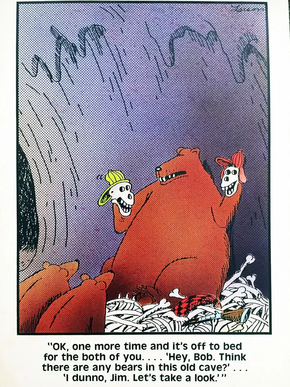 Los cómicsdel Lado Lejano a menudo ponen de relieve lo tontos que pueden llegar a ser los humanos. La mayoría de la gente sabría que no debe meterse en una cueva en un territorio donde viven osos, sobre todo si cree que puede haber osos cerca. Al utilizar a los animales para burlarse de esos ignorantes, el lector puede reírse y sentirse satisfecho, seguro de que nunca tomaría una decisión tan tonta.