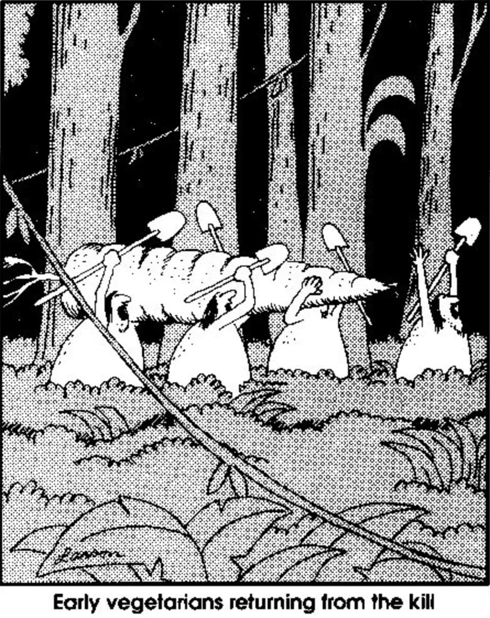 En este cómic, un grupo de hombres de las cavernas regresan de la "caza" con una zanahoria gigante, y el pie de foto los califica de "vegetarianos primitivos", lo que pone de manifiesto el amor de Larson por el absurdo, al tomar una concepción común sobre los primeros humanos y darle la vuelta en clave de humor.