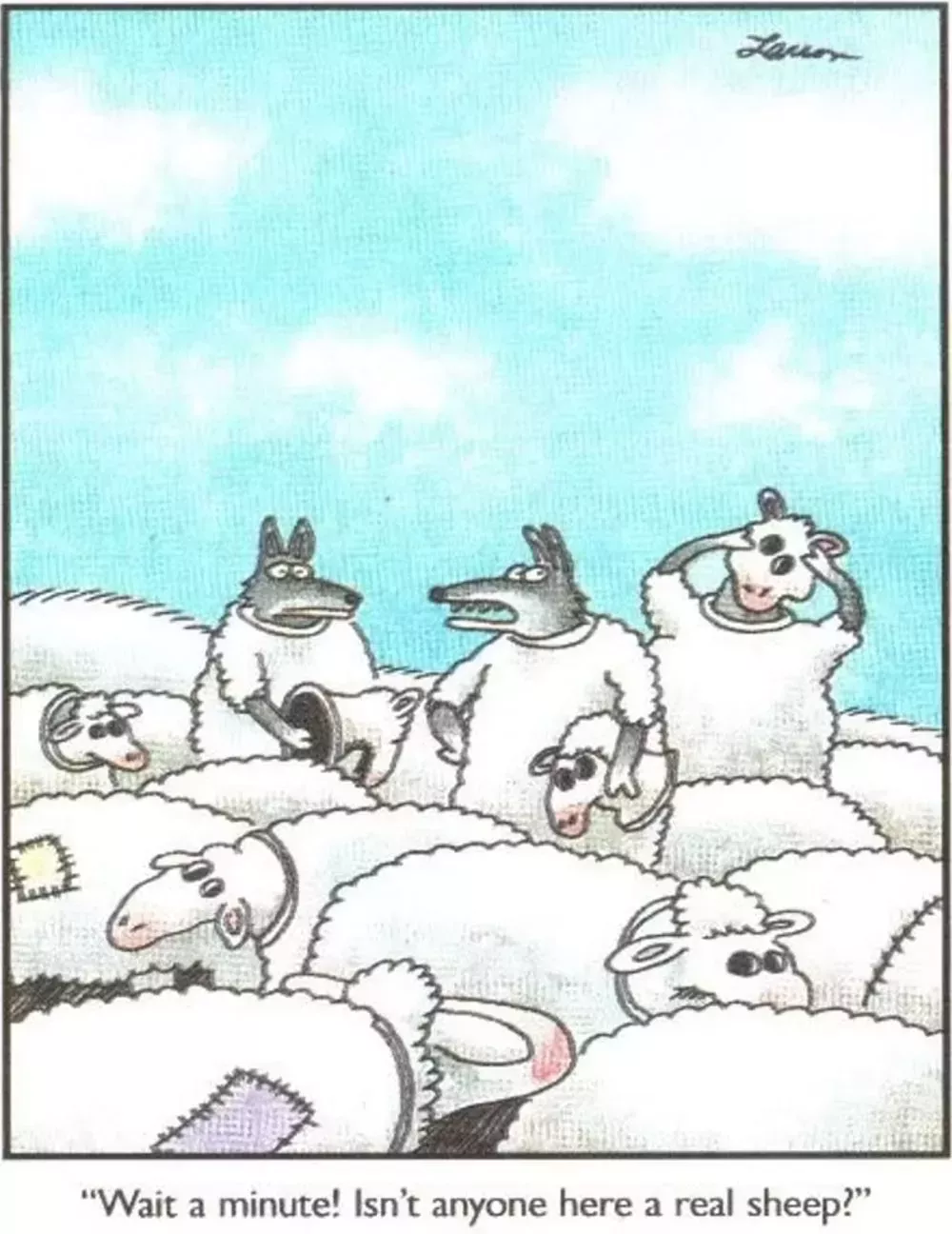A primera vista, este cómic parece el típico de The Far Side. Presenta animales que hablan, razonan y se colocan en situaciones absurdas pero divertidas. En este caso, un grupo de lobos mal disfrazados de ovejas se dan cuenta de que no hay ovejas reales que cazar entre ellos. Sólo son lobos disfrazados de ovejas.