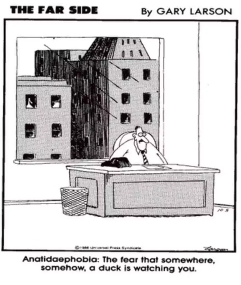 Aunque el miedo a los pájaros es una fobia reconocida, este miedo más específico fue inventado por Larson, utilizando la palabra griega para pato. Sin embargo, su habilidad para crear términos científicos llevó a mucha gente a creer que se trataba de una fobia real.