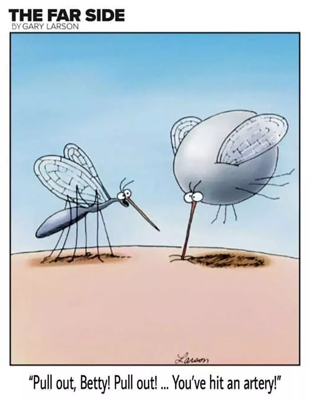 En este cómic, dos mosquitos se posan sobre la piel de una persona. Uno se infla como un globo mientras el otro le advierte que se retire porque ha tocado una arteria. La imagen mental del mosquito explotando o incluso simplemente volando como un globo sobreinflado permite al lector reírse de una experiencia universal, y repulsiva.