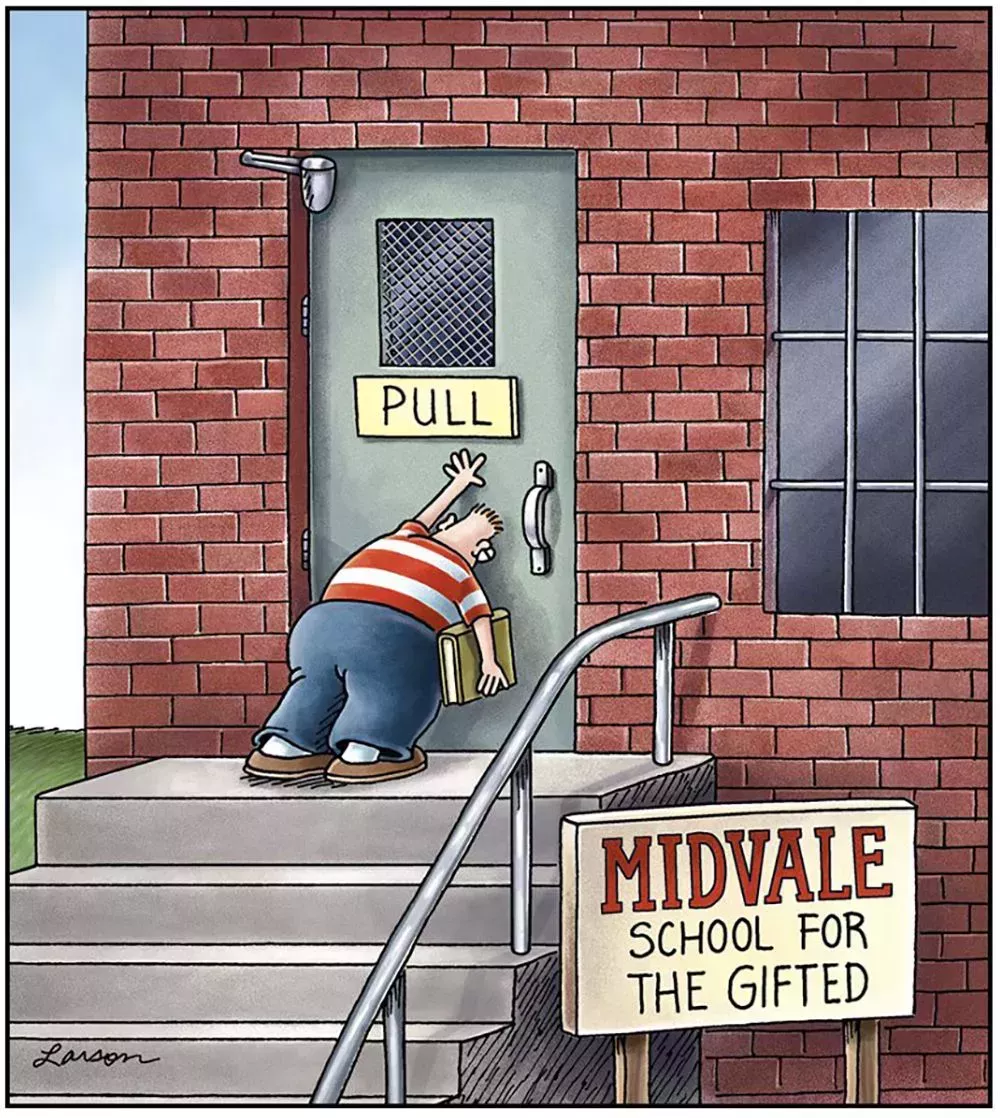 Esta es una de las tiras más famosas de The Far Side de todos los tiempos. En el cómic, un niño está empujando una puerta marcada con la palabra "pull" (tirar), con un cartel de la "Midvale School for the Gifted" (Escuela Midvale para superdotados) en primer plano. Larson vuelve a insistir en uno de sus puntos favoritos: que la inteligencia no siempre va acompañada de sentido común.