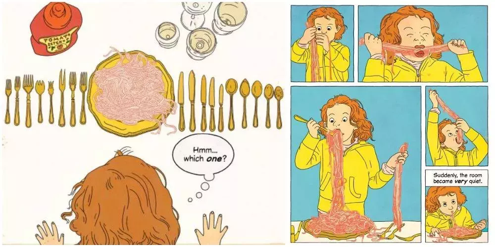 Durante la cena formal, Maya lucha contra sus malos modales en la mesa, pero no por ello deja de ser encantadora. Este cómic no se toma demasiado en serio a sí mismo y ofrece divertidísimos segmentos relacionados con los hábitos poco estelares de Maya. Maya, otra ganadora del premio Eisner, promueve la alfabetización y la individualidad a la vez que proporciona entretenimiento.