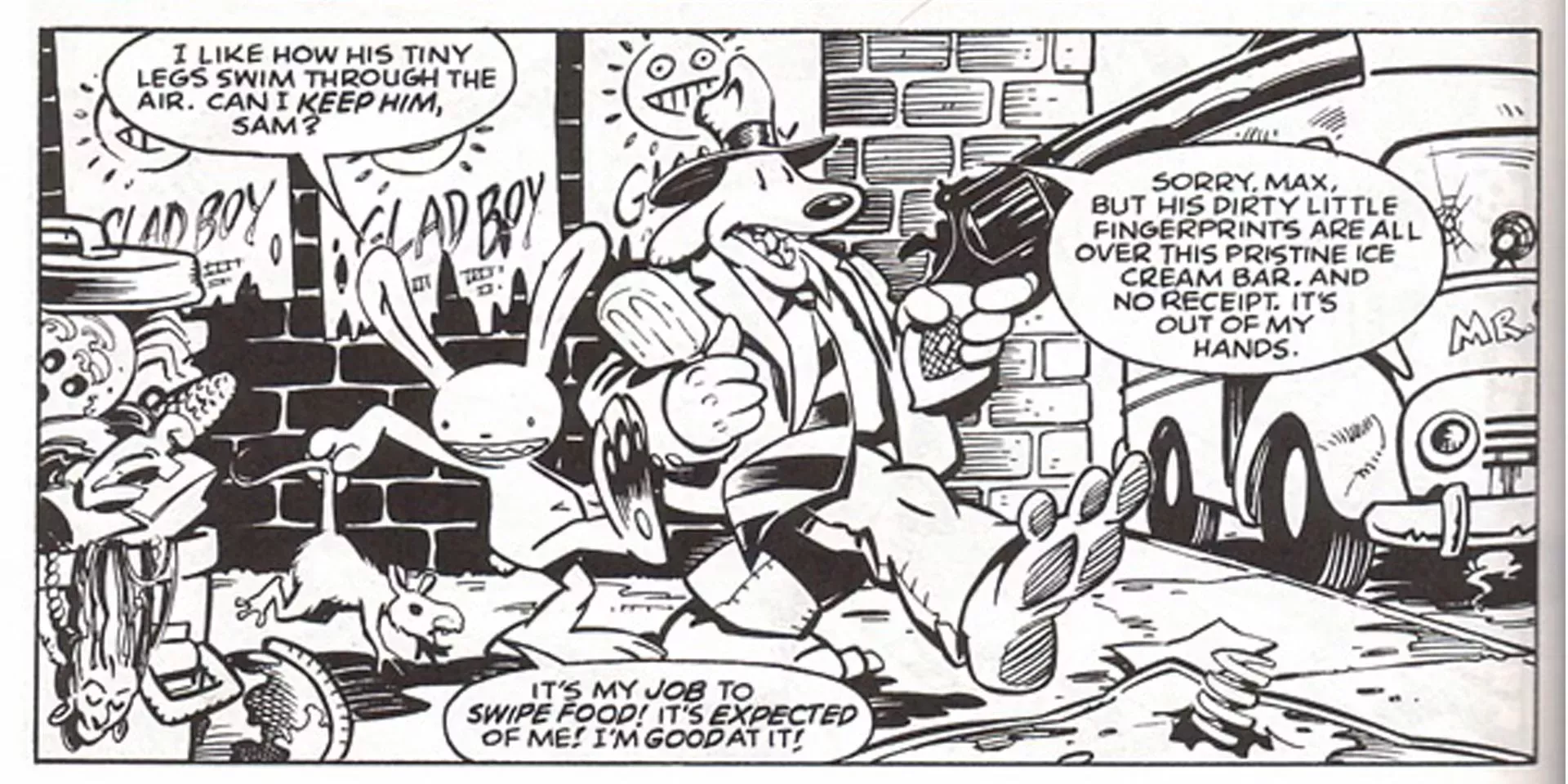 Sam & Max: Freelance Police gira en torno a un perro parecido a Chandler llamado Sam y a su compañero conejo Max, que mantienen la paz frente a amenazas extravagantes. La serie es conocida por sus diálogos conversacionales y estrafalarios y sus alocados gags visuales. Los cómics atrajeron a un público de culto, lo que dio lugar a numerosos medios de comunicación relacionados, incluidos varios juegos de aventuras gráficas creados por LucasArts.