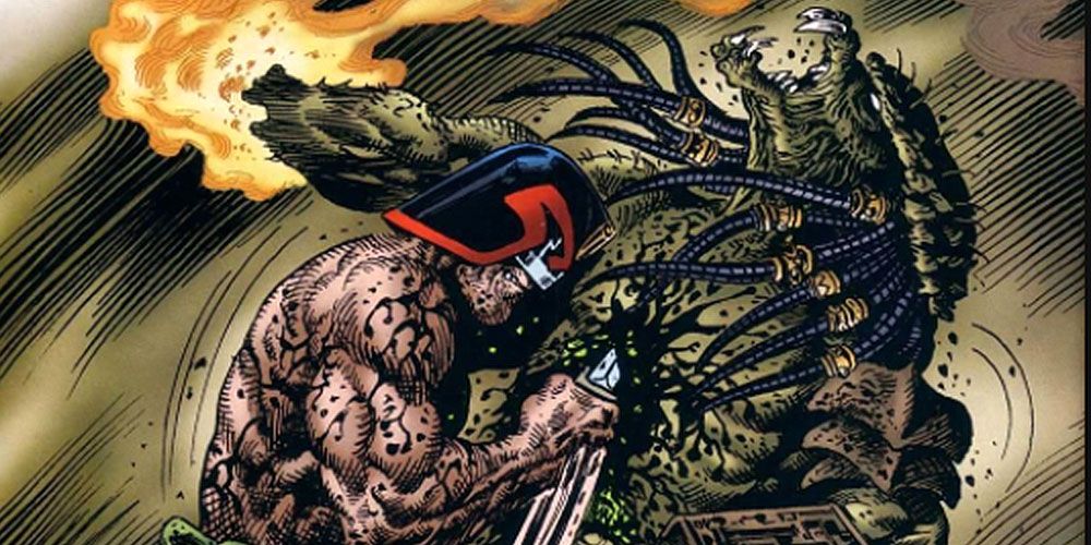 Mientras que Depredadores enfrentándose al Juez Dredd se siente como una pareja natural, la inclusión de Alienígenas en la mezcla se siente forzada y un poco chiflada. Dredd se enfrenta a un científico loco que ha empezado a unir el ADN xenomorfo para crear un ejército que invadirá y destruirá Mega City One.