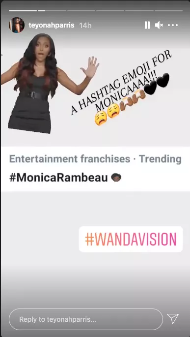 Teyonah Parris, que interpreta a Monica Rambeau, reaccionó al emoji de su propio personaje en una historia de Instagram. Su publicación contenÃa el texto "¡¡¡Un HASHTAG EMOJI PARA MONICAAAA!!!" y enfatizaba la emoción que la rodeaba con iconos de caras llorando, chocando los cinco y corazones.