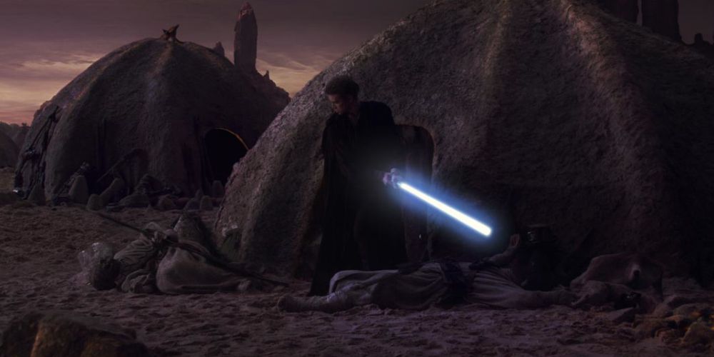 Sin embargo, va un paso más allá y comete un genocidio a pequeña escala, arrasando con todo el campamento, mujeres y niños incluidos. Las muertes le dieron a Anakin su primera prueba de la gratificación instantánea que traería el Lado Oscuro, y es un impulso al que volvería muchas veces.