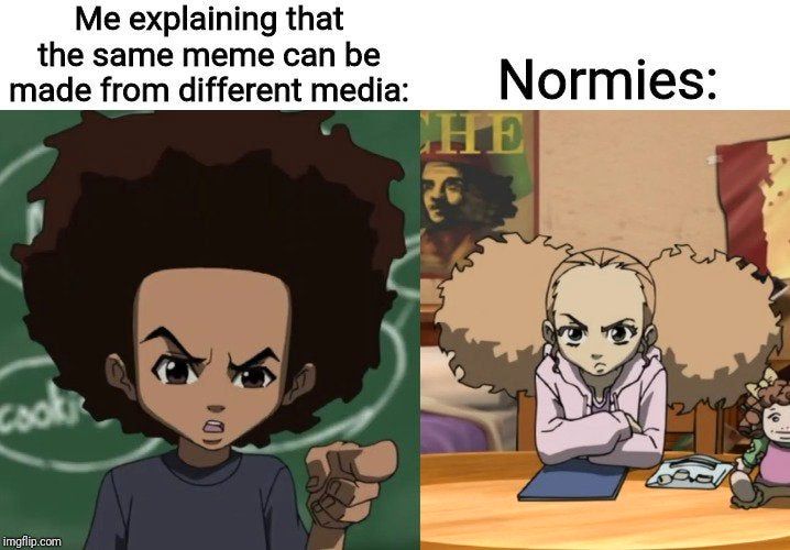 Este es otro meme sobre los memes. The Boondocks es sólo una de las muchas series de Adult Swim amadas y fuera de serie. Todas tienen diferentes tonos y enfoques de la comedia, con The Boondocks como una comedia más directa, Tim y Eric Awesome Show Great Job! como una comedia de sketches chiflados, y la versión satírica de The Eric Andre Show sobre el programa de entrevistas de la noche. Pero todos han contribuido salvajemente a la cultura del meme, desde "¡Es gratis!" hasta "¡Déjame entrar!", pasando por la inusual expresión de enojo de Tom.