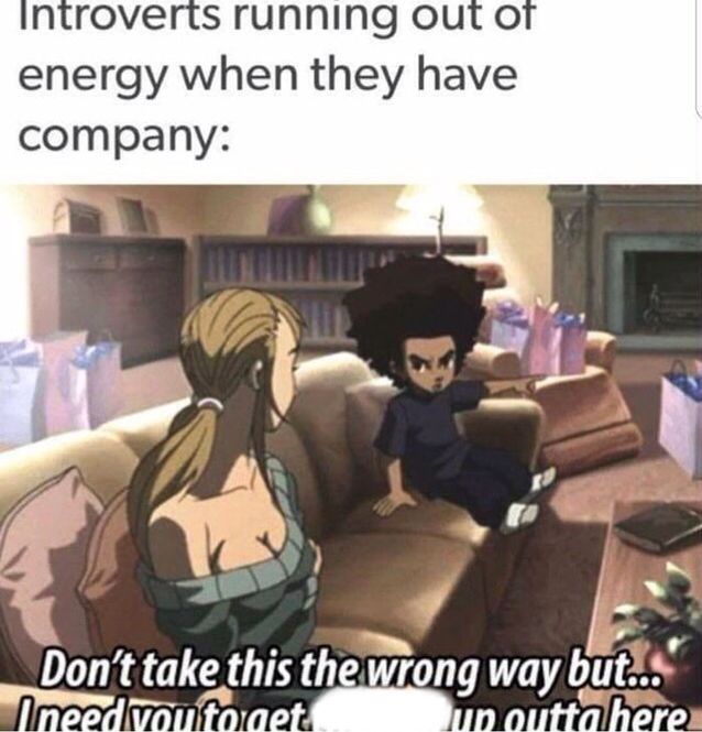 Este es uno de esos memes muy relacionados que cualquiera podría entender, sin importar si son o no fanáticos de The Boondocks o si son incluso introvertidos. Aquí Huey está sentado con una adolescente diciéndole que tiene que salir de la casa, pero realmente está tratando de ser lo más educado posible, mientras sigue siendo descaradamente Huey. Cualquier introvertido que haya tenido tanta interacción social como pueda soportar ha querido definitivamente tener alguna versión de esta conversación con sus invitados.