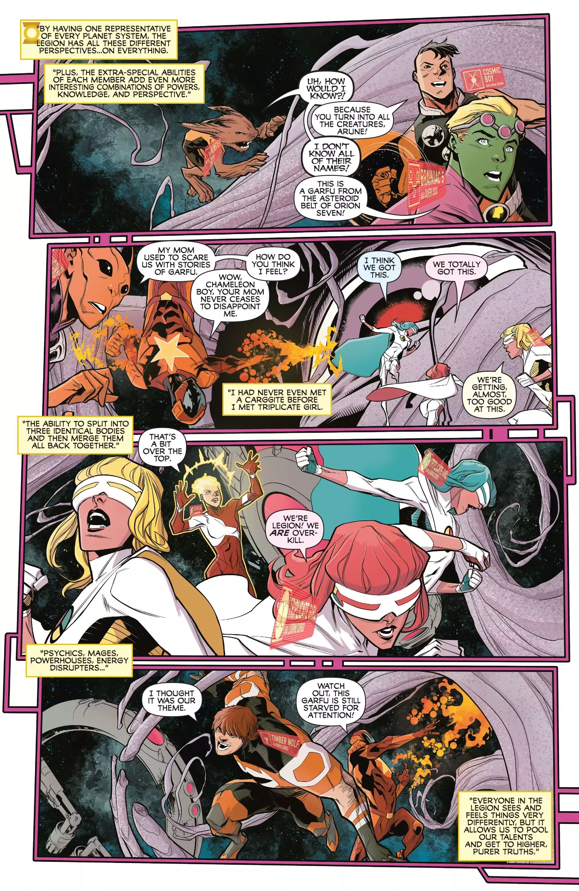 Empezamos con Young Justice y simplemente te enamoras de esos personajes y la mayor parte de eso se debe a Brian y a la forma en que los retrata, y es lo mismo con este libro. No estaba muy familiarizado con Legión, pero ahora tengo todo el material en mi lista de deseos. Quiero volver y conseguir todo. Al estar tan lejos en el futuro y en la ciencia ficción, hay un matiz extraño y mágico en la forma en que se siente todo en Legión. No se parece a nada de lo que me encuentro en los cómics y estoy muy emocionado de estar a bordo, especialmente con él en este libro en particular.
