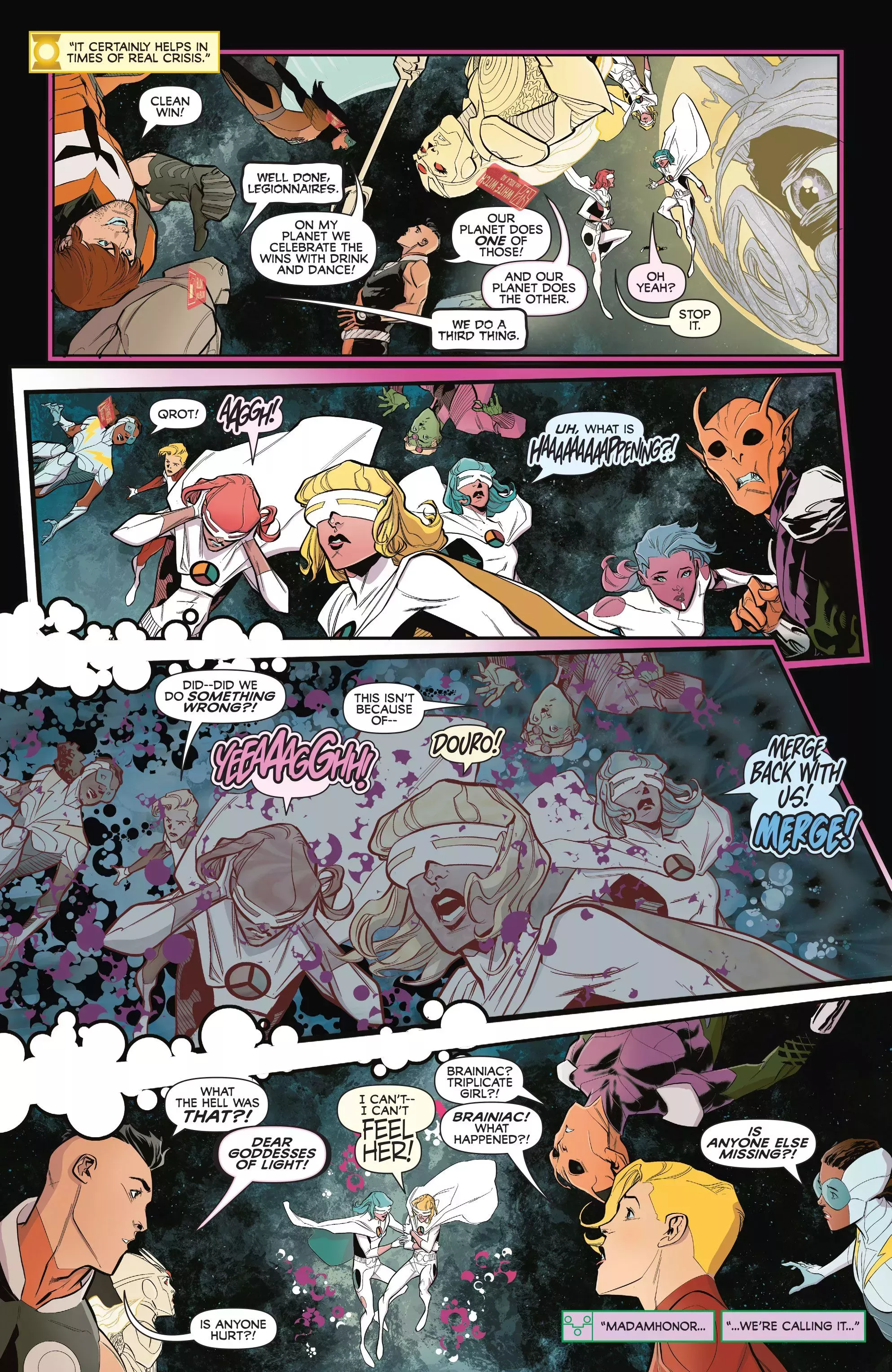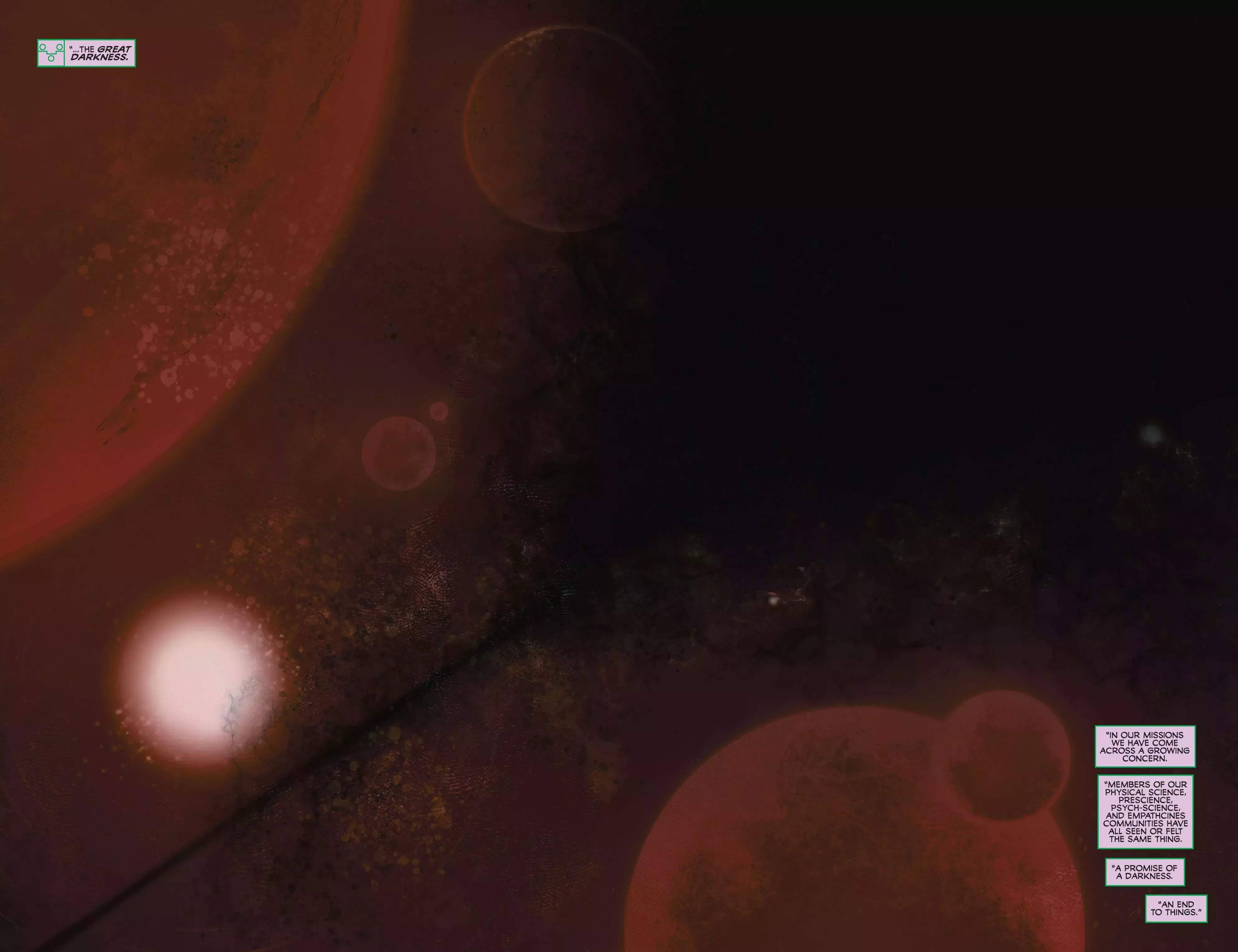 Han pasado décadas desde la Saga de la Gran Oscuridad. Con este Universo DC reconstruido, después de todos los reinicios, estamos en una lógica y verdad diferente. Pensé en celebrar lo que es la Legión, poner la Gran Oscuridad de nuevo en su mundo y también hacer que se conecte con el Universo DC más grande, porque si hay una diferencia en la Legión entre los cómics de ahora y los de entonces, es que hay un universo general al que enfrentarse, no está sólo [contenido en] el libro. El hecho de que la Liga de la Justicia y la Legión se conozcan en ese momento, es como: "Tenemos un gran problema aquí. Encantado de conocerte, pero ¡mierda!" No se trataba solo de volver a hacer la Gran Oscuridad. La Gran Oscuridad realmente significaba algo: estaba en la línea de Crisis. Está más allá de la historia de eso.