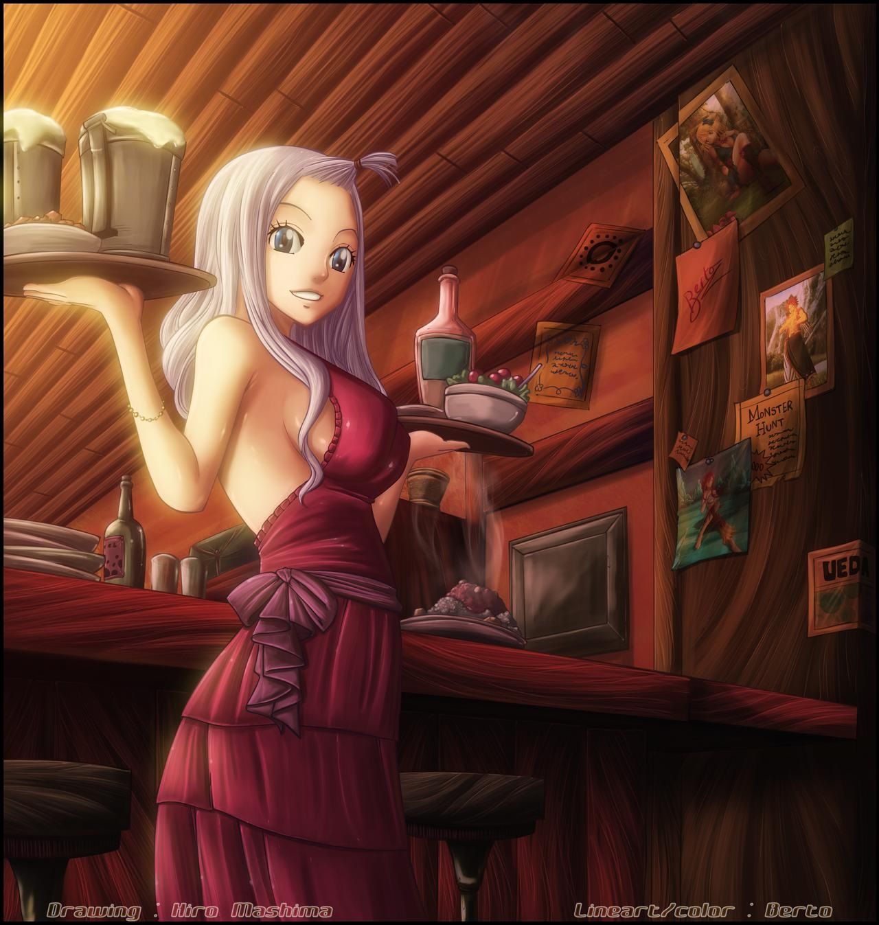 Servir cerveza no es lo único que hace Mirajane, pero es una gran manera de apoyar a sus amigos, y no hay mejor barman en Magnolia. El artista diabolumberto representó a Mirajane con un nivel de iluminación tranquilo y relajante y un fondo ricamente decorado que tiene algunas fuertes vibraciones de fantasía.