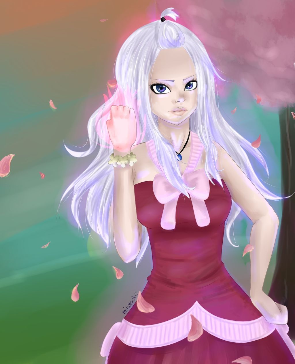 El artista Minatsukii eligió una cualidad suavemente etérea para esta pieza, con Mirajane teniendo un aura suavemente brillante a su alrededor mientras que el fondo es un borrón abstracto de hierba verde y cielo azul. Sin embargo, el árbol en flor se destaca más claramente.