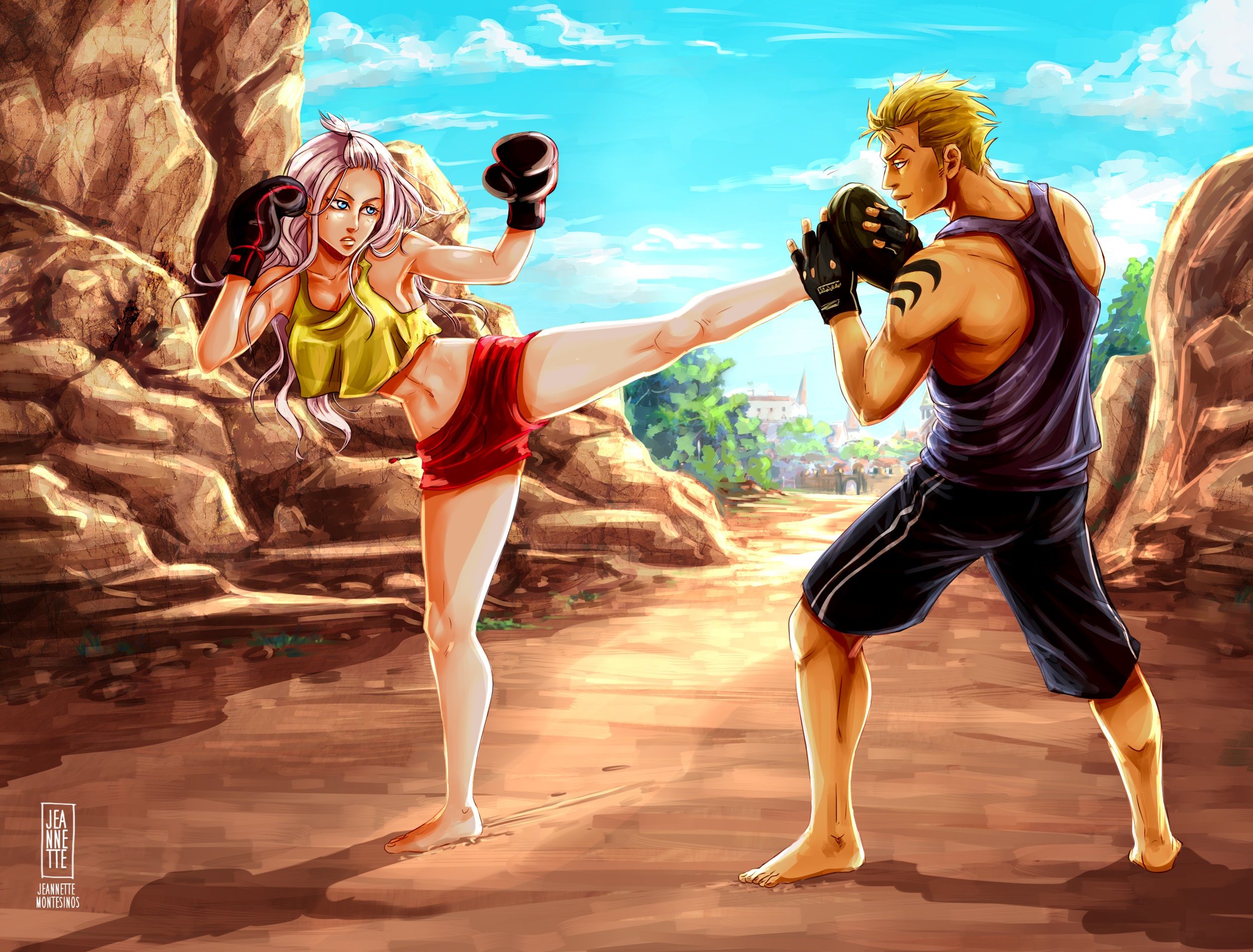 En este abanico de arte muy detallado de la artista Jeannette11, Mirajane y Laxus practican golpes de comercio en un valle rocoso con Magnolia en la distancia cercana, donde nadie puede interrumpirlos. Laxus está listo para aprender algunos movimientos nuevos, y Mirajane está feliz de enseñarle.