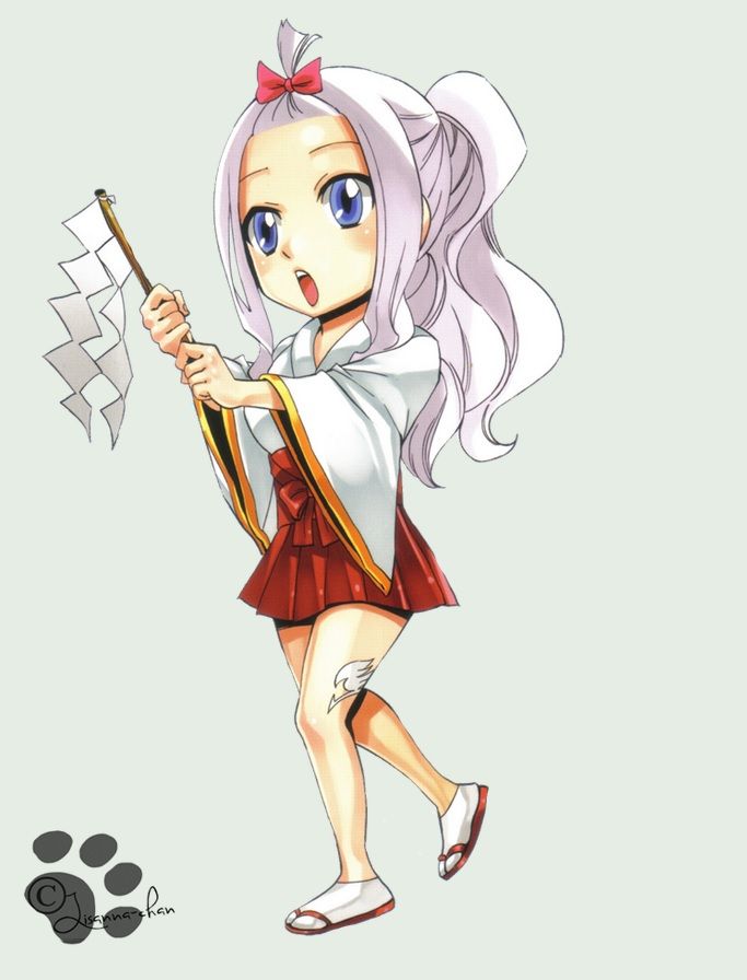 La artista Lisanna-chan decidió vestir a una chibi Mirajane como una especie de doncella de santuario, y se ve bien, las túnicas rojas y blancas rindiendo homenaje a sus trajes originales mientras marcha y lleva esos papeles en un palo. Incluso se ha añadido un lazo extra a su pelo, sólo para darle un toque visual extra.