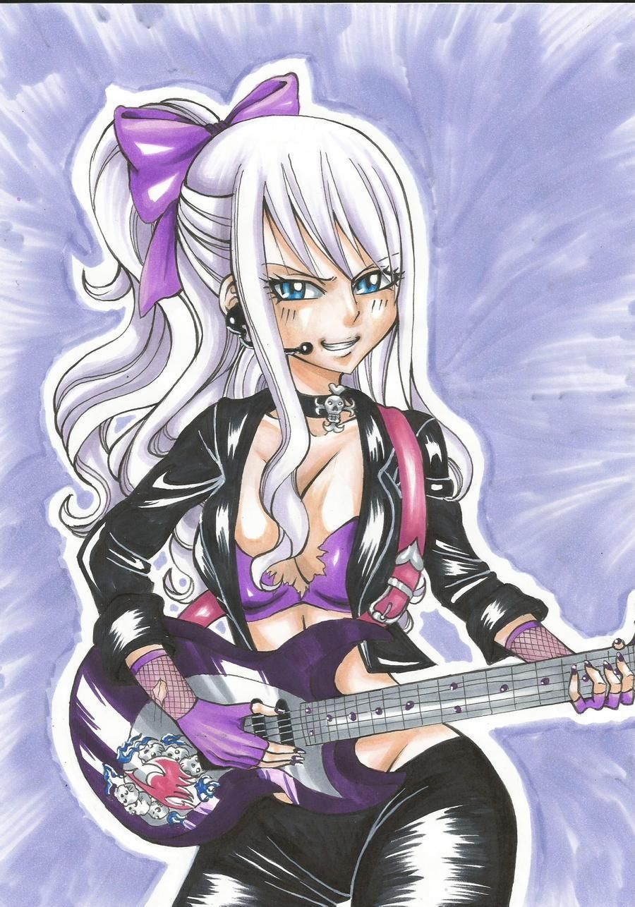 Así que la artista Devi-chans-Art rindió homenaje al estilo original rockin'-cool de Mirajane con este fan art, desde los brillantes pantalones de cuero y una chaqueta partida hasta una guitarra violeta con el logo de la Fairy Tail pintado en rojo. Incluso tiene uñas en forma de garra y una gargantilla negra con una calavera para un estilo extra punk.