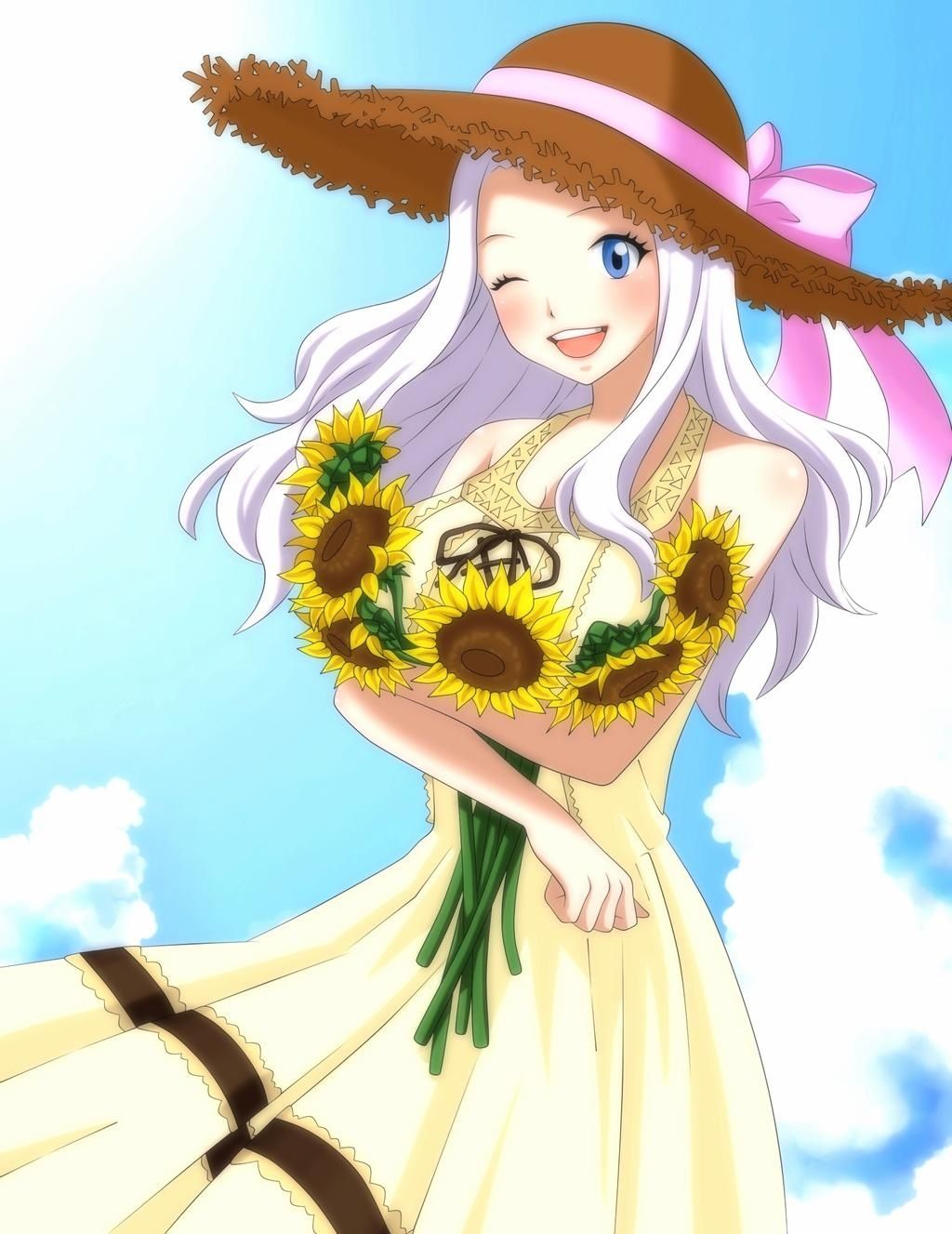 La artista Sophie4391 representa a Mirajane con un vestido amarillo y un sombrero de paja de ala ancha, mientras recoge unos cuantos girasoles y los sostiene en su pecho. Lo más probable es que le dé uno a cada una de sus queridas amigas en el salón del gremio de la Fairy Tail. Eso sería igual que ella.