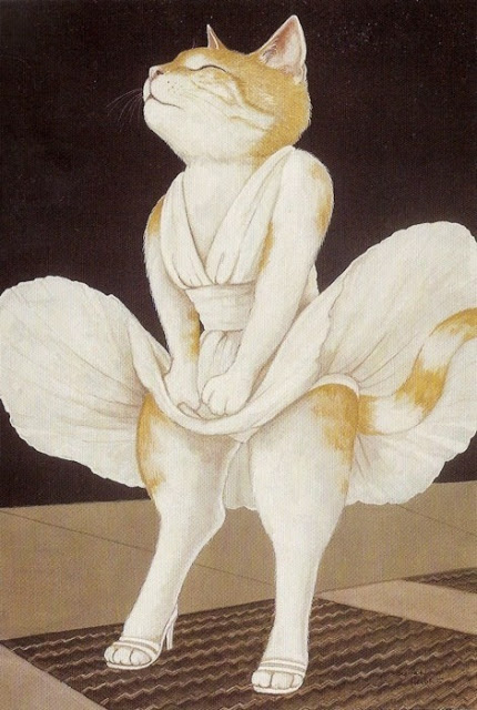 Herbert es una artista que ha logrado publicar varios libros con sus obras pictóricas pero que es conocida, sobre todo, por sus gatos antropomórficos recreando famosas escenas del mundo del cine. “Sonrisas y legañas”, “Del pelaje a la eternidad”, “Rebelde con garras”, “El Gattino”, “La tentación maúlla arriba”, “Ronroneando bajo la lluvia”, … son los títulos de algunas de sus pinturas publicadas en el libro “Gatos de película” y que comparto con vosotros en la presente galería. Lo hago porque hay un gato detrás de mí, observando en silencio, sabedor que se encuentra en mis manos la posibilidad de extender su palabra, ¡y yo no puedo negarle nada a esa carita tan blandita!