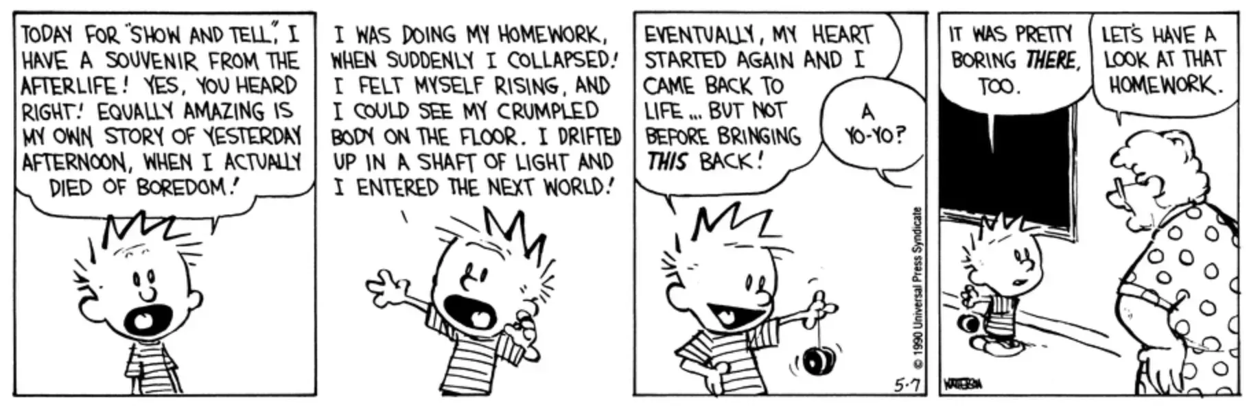 Como Calvin nunca se acuerda de sus presentaciones, a menudo coge objetos al azar de su habitación y se inventa historias místicas sobre ellos. En una tira, Calvin lleva un yoyó a clase y suelta un monólogo sobre cómo lo encontró en el más allá después de morir de aburrimiento mientras hacía los deberes. La divertidísima señorita Wormwood se da cuenta enseguida de su mentira y le pide que le enseñe los deberes.