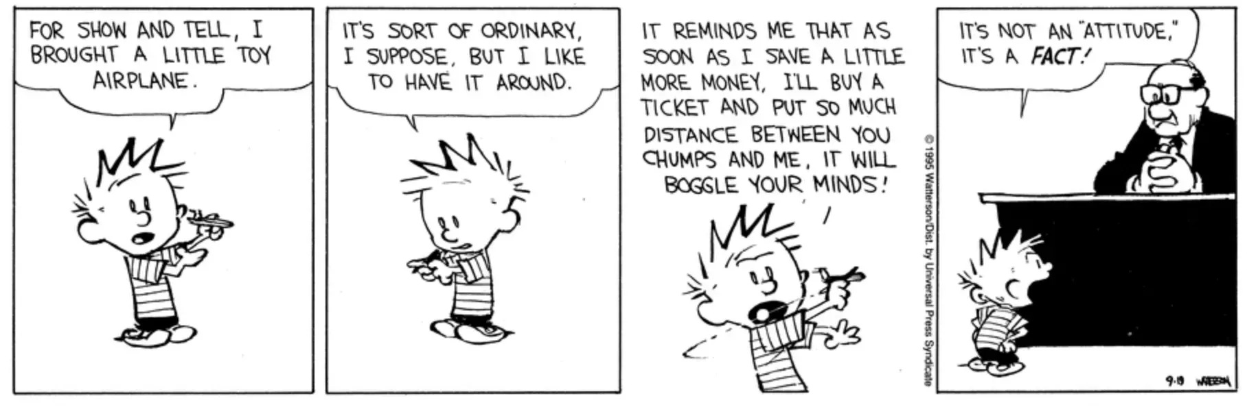 Presumir de un avión de juguete para enseñar y contar forma parte de ello. Lo utiliza como poco más que una herramienta para demostrar lo poco que le gustan los demás alumnos, lo cual es perfecto para Calvin. Incluso sin que nadie más diga una palabra en la tira, la reacción de su profesor, sus compañeros de clase y el director se comunican fácilmente, lo que demuestra lo brillante que es Bill Watterson como escritor y artista.