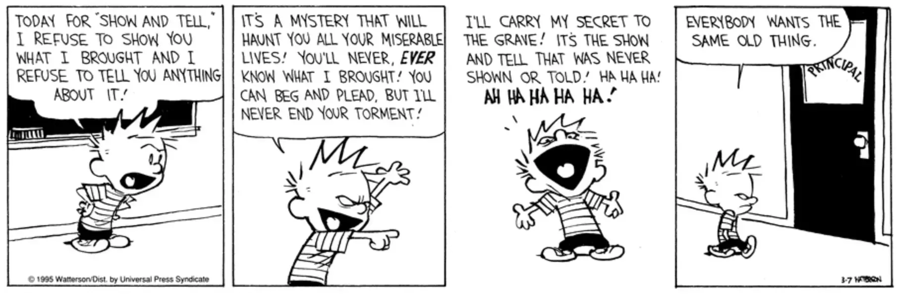 En la mayoría de las presentaciones de "enseña y cuenta", los alumnos muestran un objeto y hablan de él. Incluso en los momentos menos comprometidos de Calvin, siempre aporta algo. Por eso fue tan singular que no trajera absolutamente nada para mostrar a sus compañeros. En lugar de eso, empieza a reírse maníacamente al pensar que podría guardar su objeto como un secreto que llevarse "a la tumba".