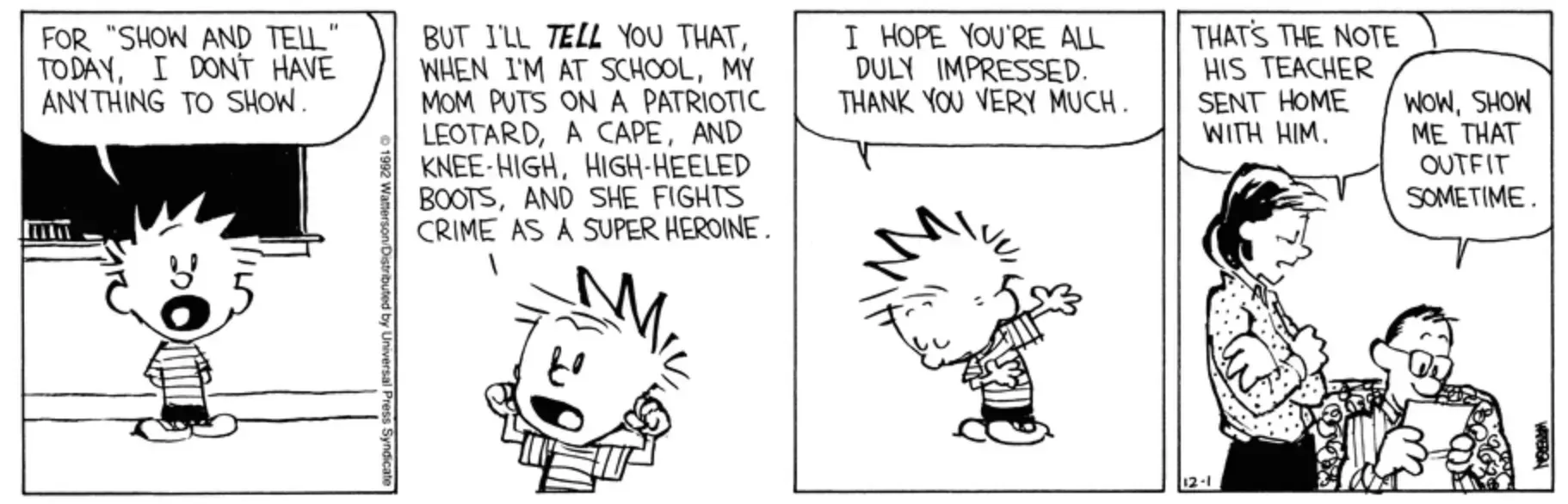 Dado que uno de sus personajes principales es un niño de seis años, Calvin y Hobbes suele pasar muchas de sus tiras en el aula. Calvin se enfrenta a menudo a los matones, hace trampas en los exámenes y se esfuerza por prestar atención a las aburridas clases como la mayoría de los niños de su edad. Otro problema al que tiene que enfrentarse es el de mostrar y contar.