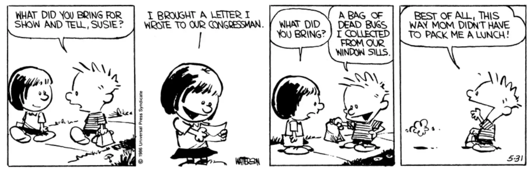 A veces eso significa llevar bichos muertos a clase, mientras que Susie sólo lleva una carta que escribió a su congresista. Es una forma excelente de contrastar sus diferentes valores, al tiempo que demuestra que Calvin siempre es consciente de lo que hace. Se mete intencionadamente con Susie para burlarse de ella, y su reacción es francamente divertida.