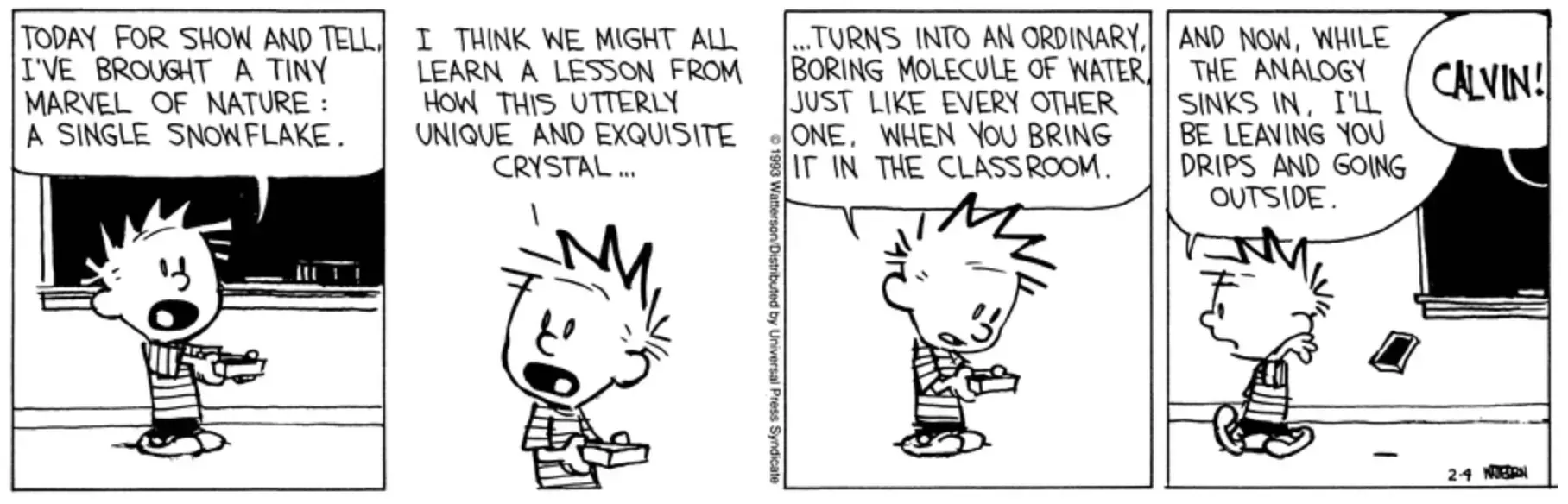 Los tres primeros paneles son lo bastante graciosos como para adaptarse a una tira de Calvin y Hobbes , dada la absoluta falta de sentido de traer un copo de nieve para mostrarlo. En el vacío, sería divertido mostrar a todo el mundo la estructura del copo de nieve, que Calvin aprovecha intencionadamente. El último panel, sin embargo, revela su plan completo, mostrando cuánto trabajo pone Calvin en hacer menos trabajo, y haciendo que la tira sea inolvidable.