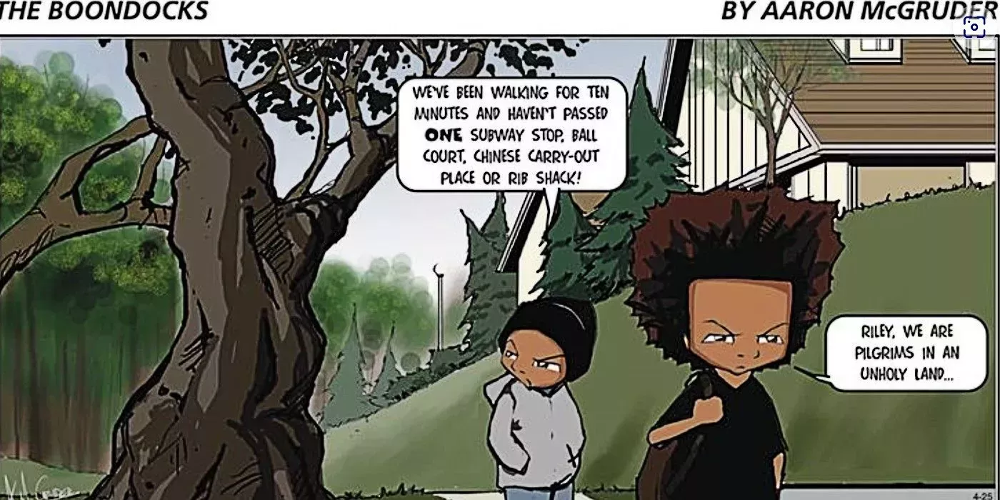 A mediados de los noventa, la mayoría de las tiras cómicas de los periódicos estaban protagonizadas en su inmensa mayoría por personajes blancos. The Boondocks, creado por Aaron McGruder, fue uno de los primeros cómics en cambiar esta situación. The Boondocks no sólo contaba con un elenco de personajes casi completamente negros, sino que además trataba sobre todo de problemas a los que se enfrentaban los negros estadounidenses. Esto lo hacía cercano al público negro y educativo para los lectores de otras razas que quizá no estuvieran al tanto de los temas que trataba.