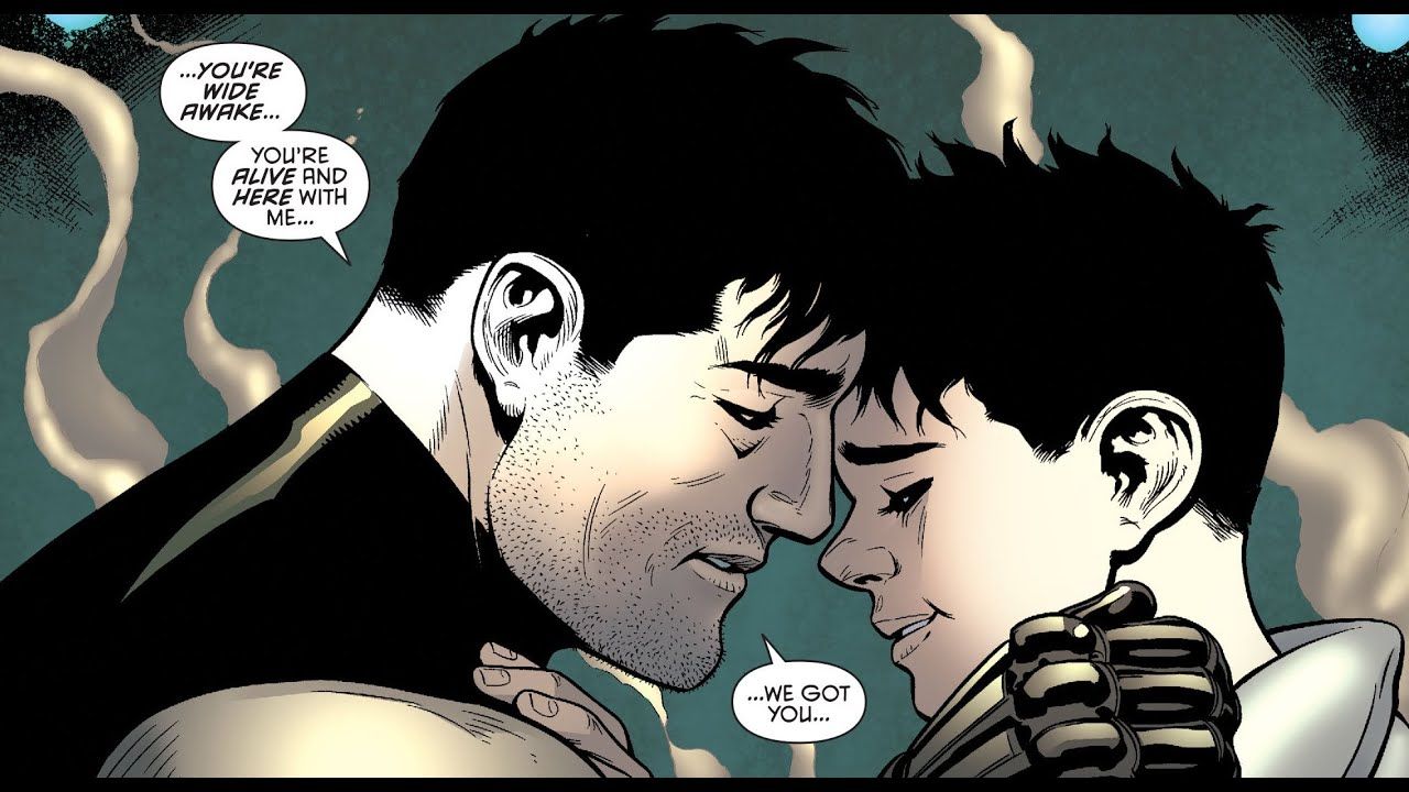 Él y Dick Grayson tienen una relación rocosa, ambos tienen formas opuestas de comunicarse, pero en Caballeros Góticos #21, lo hizo oficial. La escena en sí es un ejemplo de su dinámica, Batman mostrando su amor a través de acciones, haciendo papeles de adopción, y Dick diciendo verbalmente que lo ama antes de firmar.