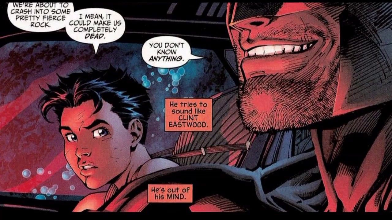 Secuestrando a Dick Grayson del circo después de haber visto morir a sus padres, el joven pregunta quién es Batman, a lo que responde: "¿Quién demonios te crees que soy? Soy el maldito Batman". Junto con citas superficiales similares, Batman atropella a la policía, insulta a todos los que conoce, abusa de Alfred Pennyworth y obliga a Dick Grayson a comer ratas.