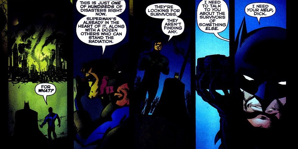 Batman realmente pasa por algunos cambios en este evento, y es en gran parte su culpa. Después de que Jaque Mate corrompa a Ojo de Hermano, los OMACs atacan a Themyscira, poniendo en riesgo la vida de miles de mujeres inocentes. Ni siquiera Bruce puede soportar esa responsabilidad, que es cuando se le da la oportunidad de "empezar de nuevo". En una conversación con el Superman de la Tierra-Dos, Bruce casi cree que es mejor reiniciar el universo... ...pero no puede dejar de preguntarse: ¿tiene ese mundo un mejor Dick Grayson? Porque, por supuesto, Bruce ve a Dick, su primer hijo, como el mejor hombre que conoce.