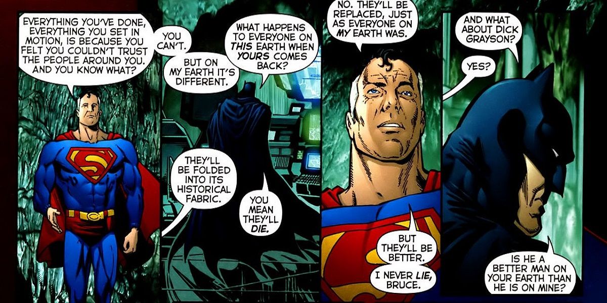La Liga de la Justicia no está muy bien cuando la mayor crisis en 20 años los golpea de repente. Batman, Superman y la Mujer Maravilla están en desacuerdo, y la Liga ya no parece existir. Discutiendo sobre lo que ha pasado en la Atalaya, Batman se harta de la moral vacía de Superman y hace un comentario bastante duro sobre la ineficacia de Supes. Al final esto se sintió como un meta-comentario, centrado en cómo Superman no había sido clave para DC desde principios de los 90.